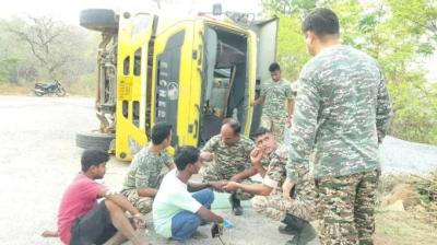 सड़क पर मौत का खेल: पुसपाल घाट में कंक्रीट हाइवा पलटा, तीन लोग घायल