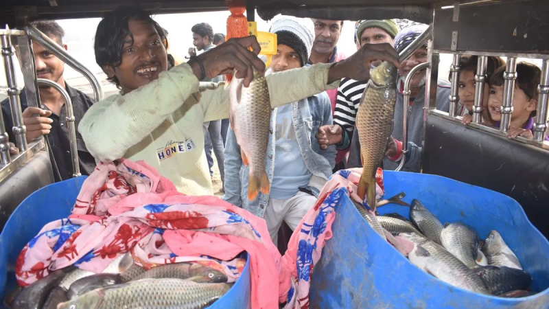 उत्तर प्रदेश के मुरादाबाद स्थित रामगंगा नदी में शुक्रवार को सुबह एक अजीबोगरीब मंजर देखने को मिला, जब जिगर कॉलोनी के पास हजारों की संख्या में मछलियां दिखाई दीं, जिससे पूरे इलाके में सनसनी मच गई. आमतौर पर शांत रहने वाले नदी के तट पर देखते ही देखते लोगों का हुजूम उमड़ पड़ा. कड़ाके की ठंड और ठिठुरते पानी की परवाह किए बिना, स्थानीय लोग और राहगीर अपनी जान जोखिम में डालकर नदी में कूद पड़े. वहां का नजारा किसी मछली बाजार से कम नहीं था, जहां हर कोई मुफ्त की मछलियां बटोरने की होड़ में शामिल हो गया |