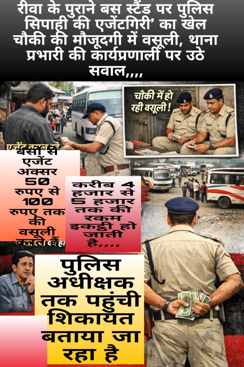 रीवा के पुराने बस स्टैंड पर पुलिस सिपाही की एजेंटगिरी’ का खेल चौकी की मौजूदगी में वसूली,थाना प्रभारी की कार्यप्रणाली पर उठे सवाल,,,,