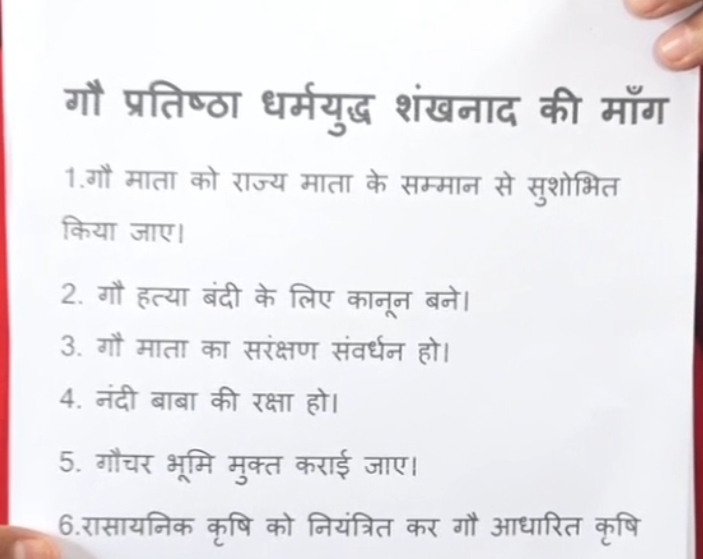पंडित अनुराग भार्गव ने कहा कि यदि सरकार ने सकारात्मक निर्णय नहीं लिया तो 33 दिन बाद भोपाल में बड़े स्तर पर आंदोलन किया जाएगा और “गोप्रतिष्ठार्थ धर्मयुद्ध का शंखनाद” होगा। उन्होंने अपनी प्रमुख मांगों को भी सामने रखा, जिनमें गौ हत्या बंदी के लिए सख्त कानून, गौ माता को राज्य माता का दर्जा, गौ संरक्षण एवं संवर्धन, नंदी बाबा की रक्षा, गौचर भूमि को मुक्त कराना और रासायनिक खेती को नियंत्रित कर गौ आधारित कृषि को बढ़ावा देना शामिल है।