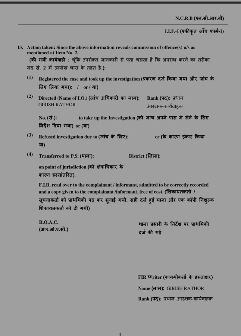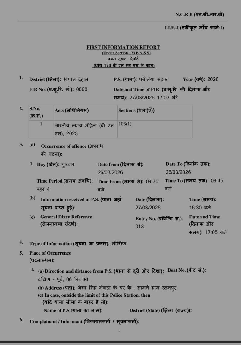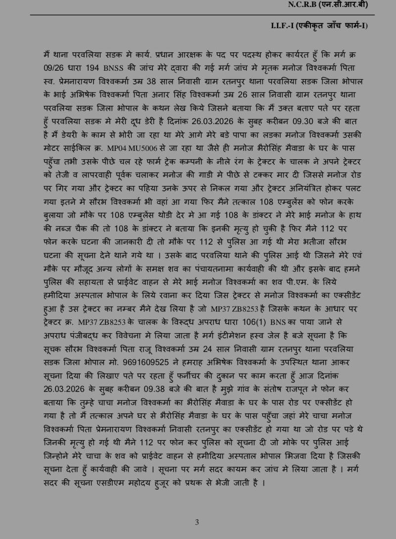 इस मामले में पुलिस ने मर्ग कायम किया था जिसकी जांच प्रधान आरक्षक गिरीश राठौर ने की। एक दिन बाद 27 मार्च की शाम को पुलिस थाना परवलिया सड़क में अपराध क्रमांक 60/26 पर एफआईआर दर्ज की गई। जिसमें मर्ग जांच में मृतक मनोज के भाई अभिषेक विश्वकर्मा के बयान के हवाले से नीले फार्मट्रैक कंपनी का रजिस्ट्रेशन नंबर एमपी 37 जेडबी 8253 लिख दिया गया।