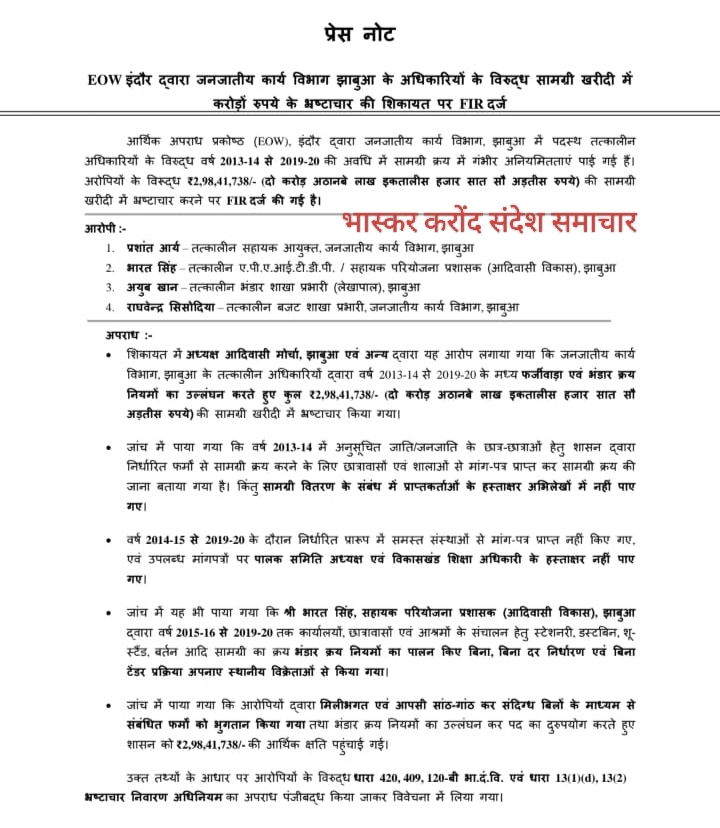 जनजातीय कार्य विभाग झाबुआ में सामग्री खरीदी के नाम पर करोड़ो के भ्रष्टाचार का बड़ा मामला सामने आया है। आर्थिक अपराध प्रकोष्ठ ईओडब्ल्यू इंदौर ने विभाग के चार तत्कालीन अधिकारियों के खिलाफ 2 करोड़ 98 लाख 41 हजार 738 रुपए की वित्तीय अनियमिताओं को लेकर एफआईआर दर्ज की है। यह गड़बड़ियां वर्ष 2013-14 से 2019-20 के बीच की बताई है।